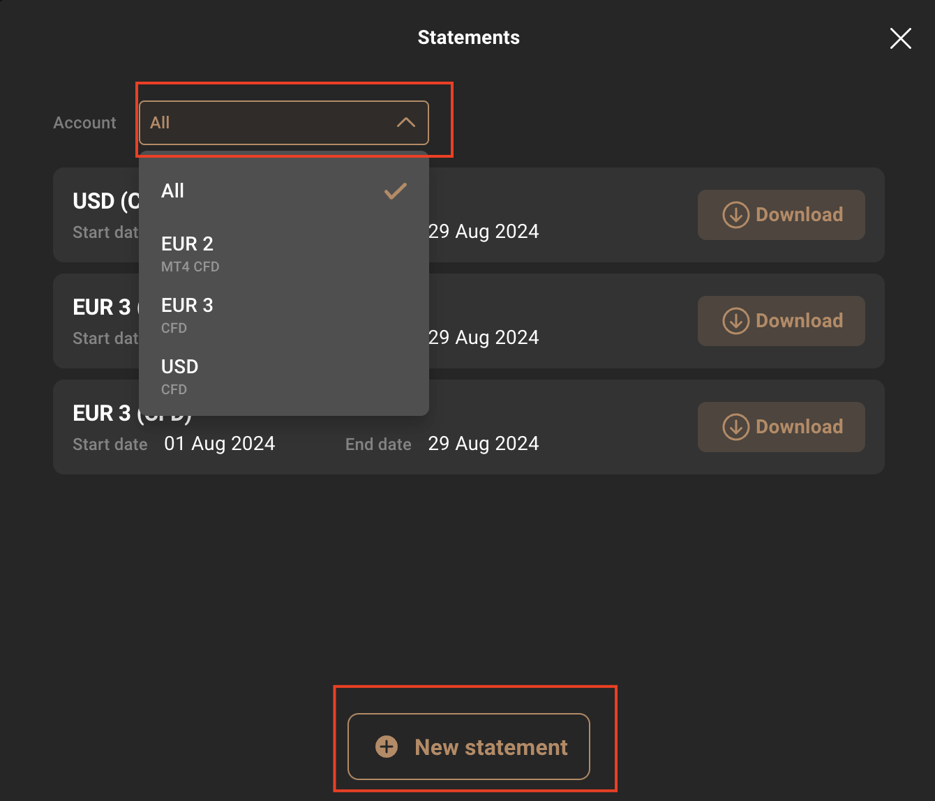 En la aplicación, vaya a ‘Cuenta’ > ‘Estados de cuenta’ > ‘Nuevo estado de cuenta’, y seleccione la cuenta y el período de tiempo relevantes antes de hacer clic en ‘Generar’.