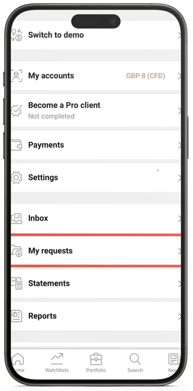 Asiakirjojen lähettämiseksi sovelluksessamme, siirry kohtaan Tili Omat pyynnöt