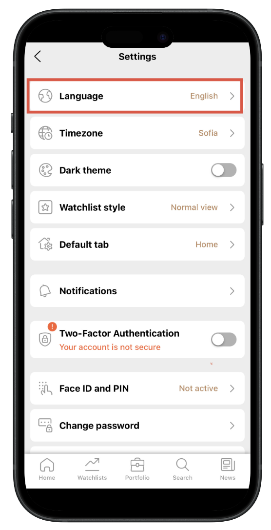 Sur l'application mobile, il suffit d'appuyer sur Compte (coin supérieur gauche), d'aller dans Paramètres, puis Langue (première option). Appuyez sur la langue vers laquelle vous souhaitez changer, puis appuyez sur le bouton de retour pour enregistrer.