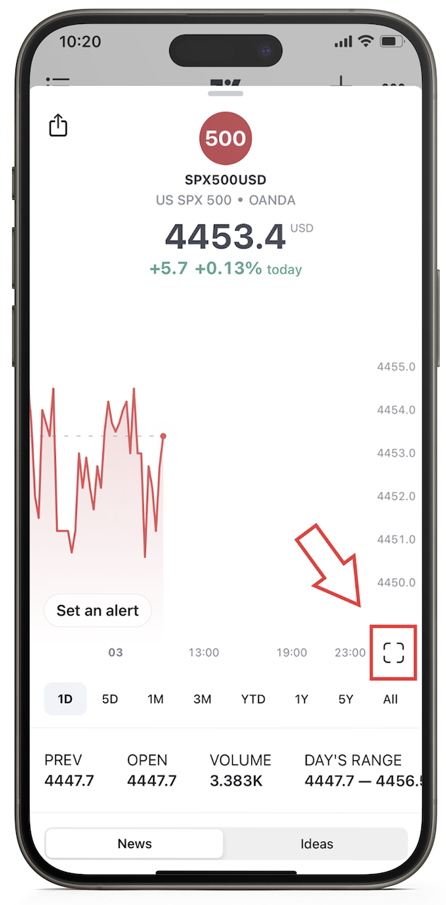 Idite u odjeljak Watchlist, odaberite instrument koji želite pregledati i kliknite na njega. Vidjet ćete skočni prozor s grafikonima i vijestima za točno taj tržišni instrument. Kliknite na ikonu preko cijelog zaslona odmah ispod grafikona u donjem desnom kutu.