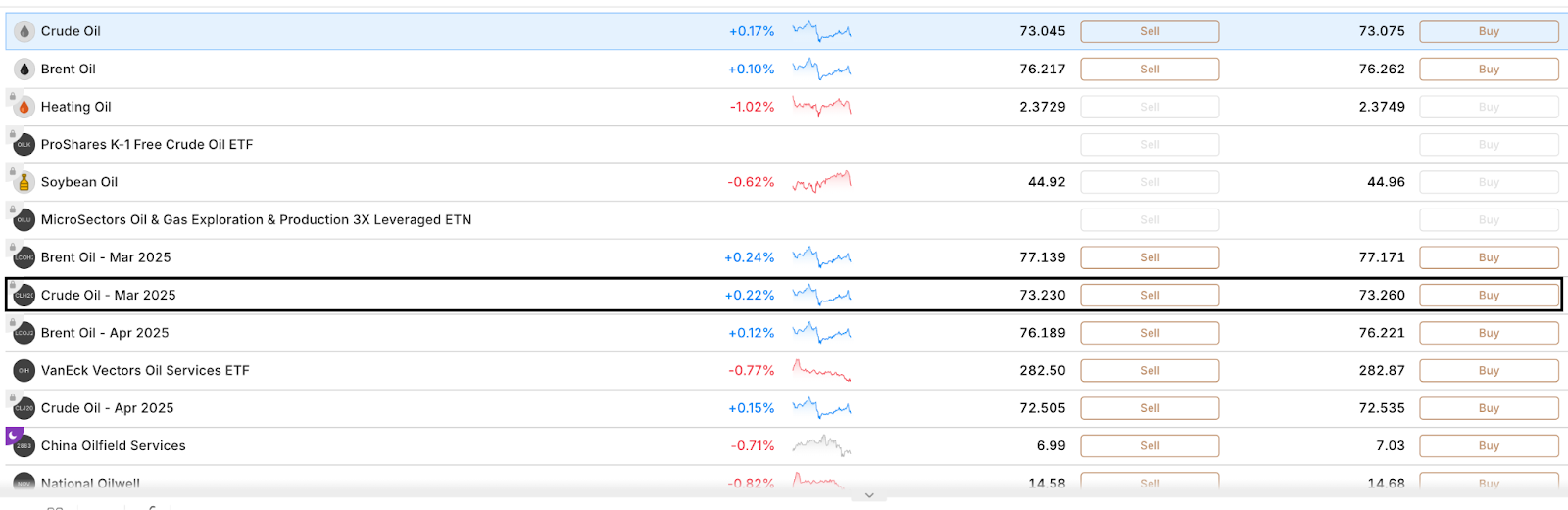 Međutim, futures se također mogu trgovati u obliku CFD-ova kao derivata (vidi dolje), što je način na koji ćete ih trgovati koristeći našu platformu. Ispod ćete vidjeti CFD za futures na sirovu naftu s istekom u ožujku, rezultat pretraživanja tržišta.